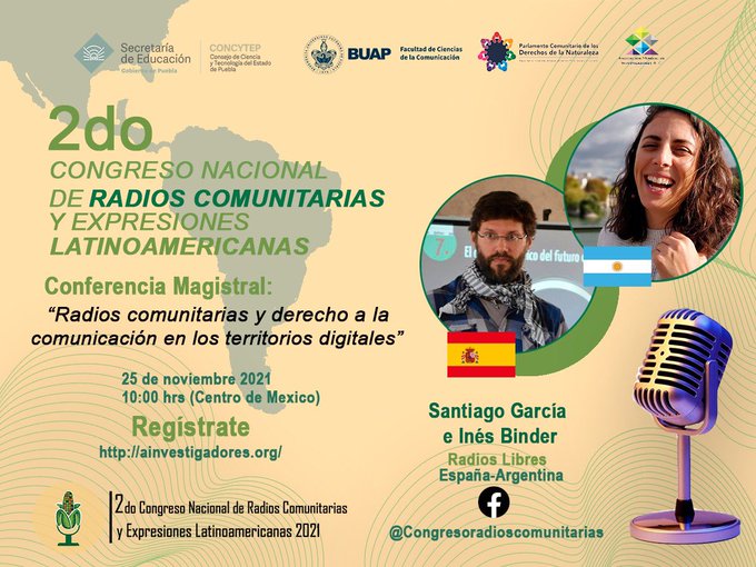 El Consejo de Ciencia y Tecnología del Estado de Puebla, la Facultad de Ciencias de la Comunicación de la Benemérita Universidad Autónoma de Puebla y el Parlamento Comunitario de los Derechos de la Naturaleza invitan al 2º Congreso Nacional de Radios Comunitarias y Expresiones Latinoamericanas 2021. La participación es libre y gratuita, con inscripción previa. Se puede consultar la programación de charlas, conferencias y talleres en https://ainvestigadores.org/